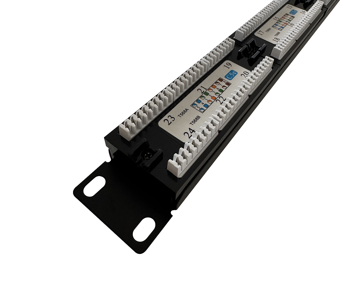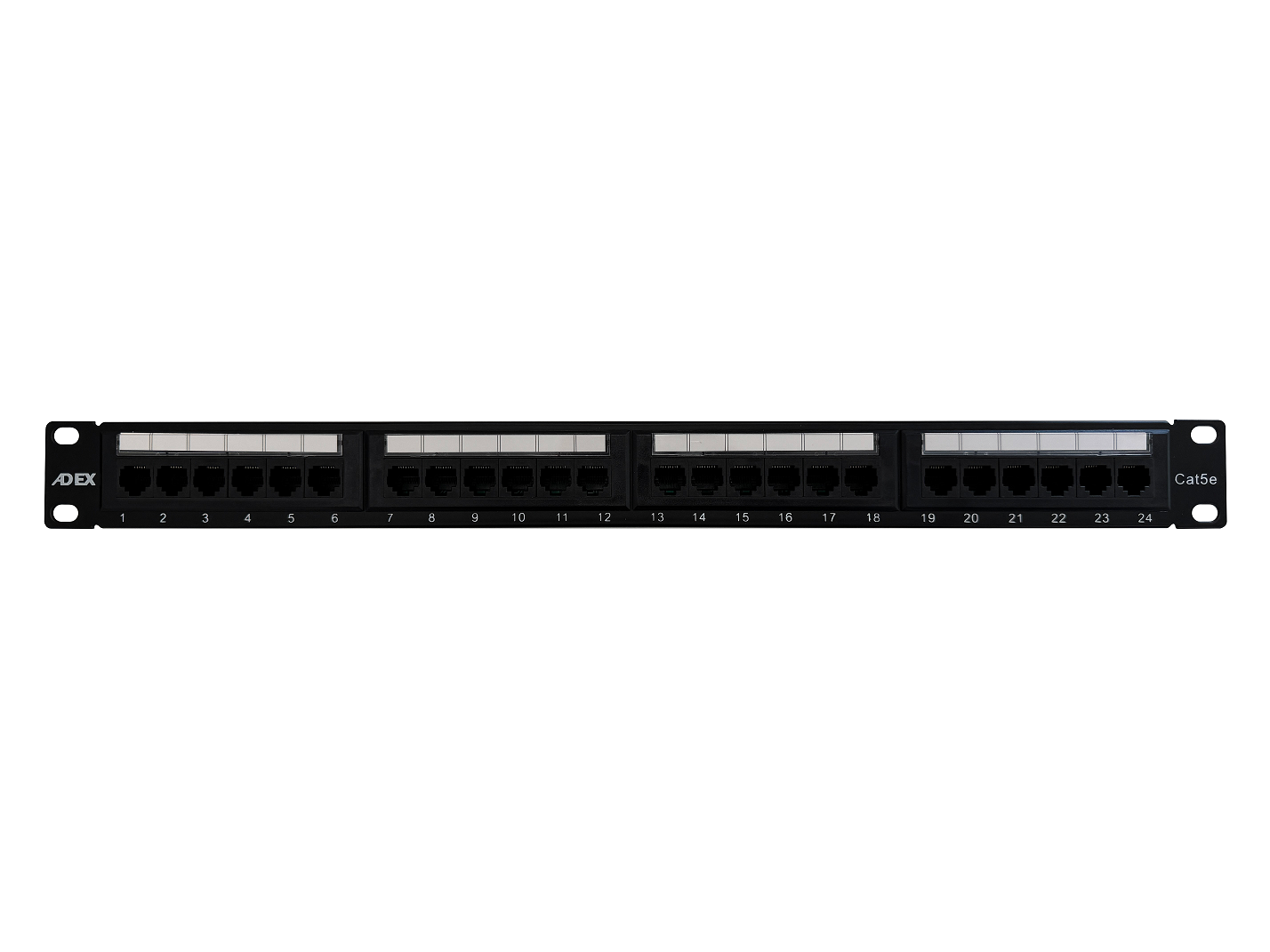Připojovací plně osazený patch panel značky Adex v provedení CAT5e UTP. Pro připojení je k dispozici 24 portů RJ45, pro montáž do 19" rozvaděče. Montáž kabeláže se provádí pomocí zářezových svorkovnic a zadního vyvazovacího panelu.