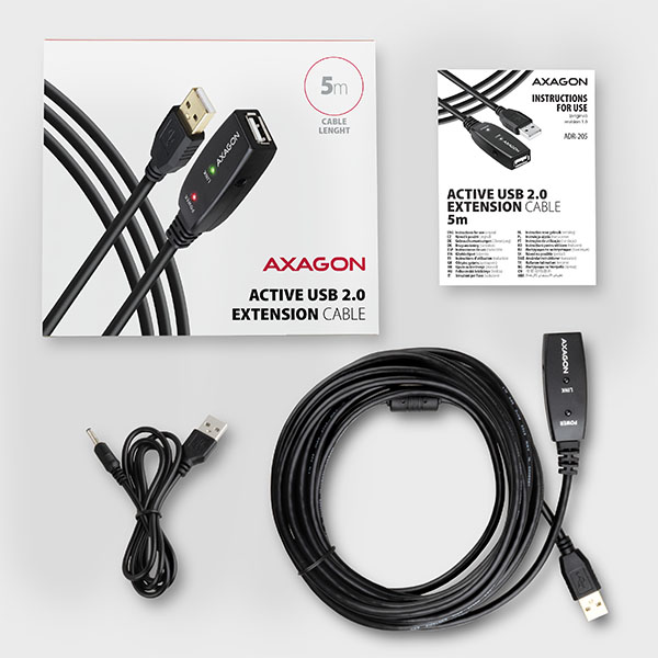 Aktivní prodlužovací USB 2.0 kabel AXAGON ADR-205 délky 5 metrů je ideální k propojení Vašeho počítače s USB zařízením jako je myš, klávesnice, webkamera, tiskárna, skener, plotr a dalšími. Aktivní USB repeater kabel zesiluje průchozí signál a umožnuje připojit USB zařízení na výrazně větší vzdálenost, než Vám umožní pasivní kabel. Dosah kabelu je možné dále prodloužit použitím několika kabelů za sebou. Velkou výhodou kabelu ADR-205 je integrovaný konektor přídavného napájení. Ve většině případů postačí napájení po USB sběrnici, avšak u zařízení s větším odběrem může být při větších vzdálenostech USB napájení nedostatečné a přídavné napájení ze sítě může v těchto případech problém vyřešit. Výjimečně kompaktní tělo repeater kabelu dovoluje bezproblémové použití v elektromontážních lištách nebo kabelových systémech. Použití kvalitního stíněného kabelu zaručuje vysokou rychlost komunikace a minimální nežádoucí interference. Vstup: • USB 2.0 pro připojení k počítači • konektor USB typu A (M) male (samec) Výstup: • USB 2.0 pro připojení vzdáleného USB zařízení • konektor USB typu A (F) female (samice) • Přenosová rychlost 480 / 12 / 1.5 Mbit/s (high / full / low speed) Napájení: • Napájení kabelu i připojených zařízení po USB sběrnici (bus-power mód 5V - 500mA). • Pro většinu připojených USB zařízení je napájení po USB sběrnici dostatečné a není potřeba žádné přídavné napájení. • Aktivní část kabelu obsahuje konektor (O 3.5 x 1.3mm vnější x vnitřní průměr) pro přídavné externí napájení 5V/1-2A. • Napájecí kabel USB A-M / 3.5mm jack délky 1.2 m je součástí balení. Kabel umožní napájení z běžné nabíječky mobilních telefonů s USB-A výstupem 5V / min. 1A, např. AXAGON ACU-DS16. • Při napájení repeater kabelu napájecím adaptérem lze připojit i externí 2.5" disk bez potřeby vlastního napájení disku. • U delší USB trasy s několika repeater kabely zapojenými za sebou může být již napájení po USB sběrnici nedostatečné i pro USB zařízení s nižším odběrem než externí 2.5" disk. Také v tomto případě může pomoci posílení napájení připojením napájecího adaptéru. Další vlastnosti: • Plně kompatibilní s USB 2.0 a zpětně kompatibilní s USB 1.1. • Plná podpora Plug and Play a Hot Plug. • Dvě LED indikující připojení k napájení a připojení USB zařízení. • Za aktivním USB kabelem může být použit i běžný pasivní USB kabel. • Rozměry aktivní části jsou 74 x 22 x 13 mm, kabel délky 5 m. • Váha 170 g. Podporované operační systémy: • MS Windows XP / Vista / 7 / 8 / 8.1 / 10 / 11 a novější, Windows Server 2003 / 2008 / 2012 / 2016 / 2019 / 2022 a novější (podporovány všechny 32- i 64-bitové verze OS Windows), Mac OS X 10.x a vyšší, Linux s jádrem 2.6.x a vyšším. • Pozn.: Ovladače jsou součástí podporovaných operačních systémů a nainstalují se zcela automaticky. Žádné jiné ovladače není třeba instalovat a nejsou ani k dispozici. Balení v kartonové krabičce obsahuje: • USB 2.0 A-M > A-F aktivní kabel délky 5 m, • USB-A / 3.5 mm napájecí kabel, • vícejazyčný návod CZ/DE/DK/ENG/ESP/FIN/FR/GR/HR/HU/IT/NL/PL/PT/RO/RU/SK/SWE/BG/CN/TR/ARA.