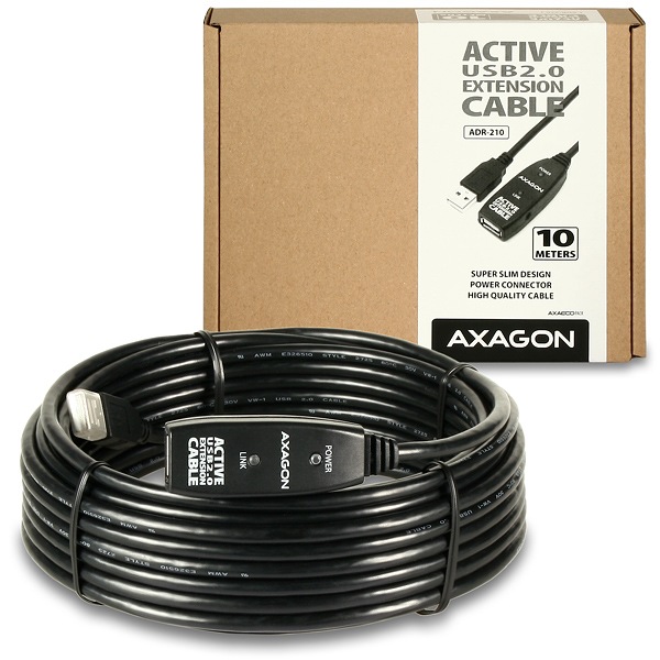 Aktivní prodlužovací USB 2.0 kabel AXAGON ADR-210 délky 10 metrů je ideální k propojení Vašeho počítače s USB zařízením jako je myš, klávesnice, webkamera, tiskárna, skener, plotr a dalšími. Aktivní USB repeater kabel zesiluje průchozí signál a umožnuje připojit USB zařízení na výrazně větší vzdálenost, než Vám umožní pasivní kabel. Dosah kabelu je možné dále prodloužit použitím několika kabelů za sebou. Velkou výhodou kabelu ADR-210 je integrovaný konektor přídavného napájení. Ve většině případů postačí napájení po USB sběrnici, avšak u zařízení s větším odběrem může být při větších vzdálenostech USB napájení nedostatečné a přídavné napájení ze sítě může v těchto případech problém vyřešit. Výjimečně kompaktní tělo repeater kabelu dovoluje bezproblémové použití v elektromontážních lištách nebo kabelových systémech. Použití kvalitního stíněného kabelu zaručuje vysokou rychlost komunikace a minimální nežádoucí interference. Vstup: • USB 2.0 pro připojení k počítači • konektor USB typu A (M) male (samec) Výstup: • USB 2.0 pro připojení vzdáleného USB zařízení • konektor USB typu A (F) female (samice) • Přenosová rychlost 480 / 12 / 1.5 Mbit/s (high / full / low speed) Napájení: • Napájení kabelu i připojených zařízení po USB sběrnici (bus-power mód 5V - 500mA). • Pro většinu připojených USB zařízení je napájení po USB sběrnici dostatečné a není potřeba žádné přídavné napájení. • Aktivní část kabelu obsahuje konektor (O 3.5 x 1.3mm vnější x vnitřní průměr) pro přídavné externí napájení 5V/1-2A. • Napájecí kabel USB A-M / 3.5mm jack délky 1.2 m je součástí balení. Kabel umožní napájení z běžné nabíječky mobilních telefonů s USB-A výstupem 5V / min. 1A, např. AXAGON ACU-DS16. • Při napájení repeater kabelu napájecím adaptérem lze připojit i externí 2.5" disk bez potřeby vlastního napájení disku. • U delší USB trasy s několika repeater kabely zapojenými za sebou může být již napájení po USB sběrnici nedostatečné i pro USB zařízení s nižším odběrem než externí 2.5" disk. Také v tomto případě může pomoci posílení napájení připojením napájecího adaptéru. Další vlastnosti: • Plně kompatibilní s USB 2.0 a zpětně kompatibilní s USB 1.1. • Plná podpora Plug and Play a Hot Plug. • Dvě LED indikující připojení k napájení a připojení USB zařízení. • Za aktivním USB kabelem může být použit i běžný pasivní USB kabel. • Rozměry aktivní části jsou 74 x 22 x 13 mm, kabel délky 10 m. • Váha 330 g. Podporované operační systémy: • MS Windows XP / Vista / 7 / 8 / 8.1 / 10 / 11 a novější, Windows Server 2003 / 2008 / 2012 / 2016 / 2019 / 2022 a novější (podporovány všechny 32- i 64-bitové verze OS Windows), Mac OS X 10.x a vyšší, Linux s jádrem 2.6.x a vyšším. • Pozn.: Ovladače jsou součástí podporovaných operačních systémů a nainstalují se zcela automaticky. Žádné jiné ovladače není třeba instalovat a nejsou ani k dispozici. Balení v kartonové krabičce obsahuje: • USB 2.0 A-M > A-F aktivní kabel délky 10 m, • USB-A / 3.5 mm napájecí kabel, • vícejazyčný návod CZ/DE/DK/ENG/ESP/FIN/FR/GR/HR/HU/IT/NL/PL/PT/RO/RU/SK/SWE/BG/CN/TR/ARA.