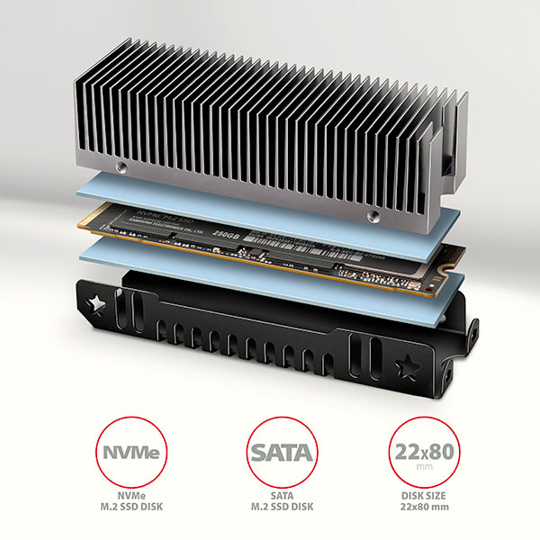 AXAGON CLR-M2XT, hliníkový pasivní chladič pro jedno i oboustranný M.2 SSD disk, výška 24 mm