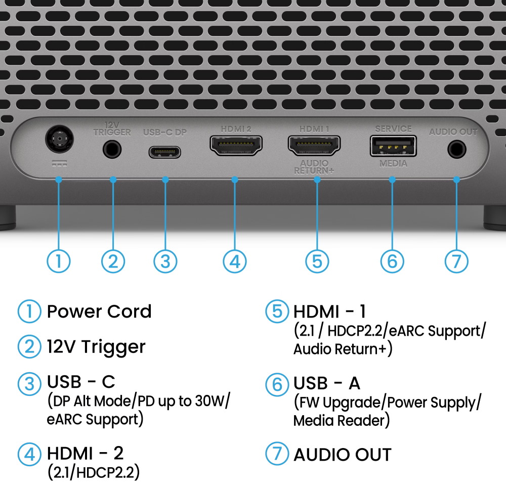 Konektivita: Wi-Fi (802.11a/b/g/n/ac/ax), Bluetooth 5.2, 2× HDMI, 1× USB, 1× USB-C (PD 30 W), 1× 12V trigger, 1× 3,5mm audio výstup