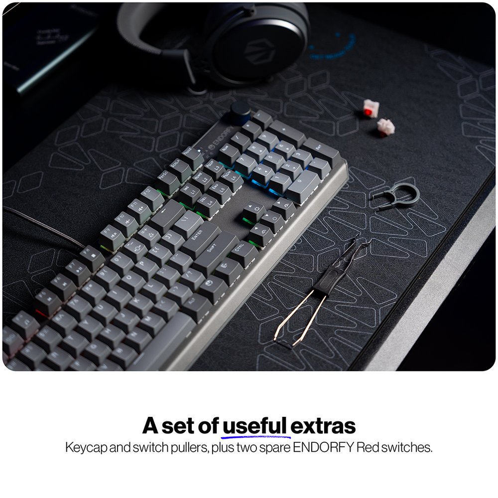 Továrně předlubrikované spínače s nylonovou základnou a mléčným pouzdrem pro lepší rozptyl světla. Inspirované oblíbenými spínači Endorfy Yellow, nabízejí rychlou odezvu a hladký stisk s hlubokým akustickým profilem.