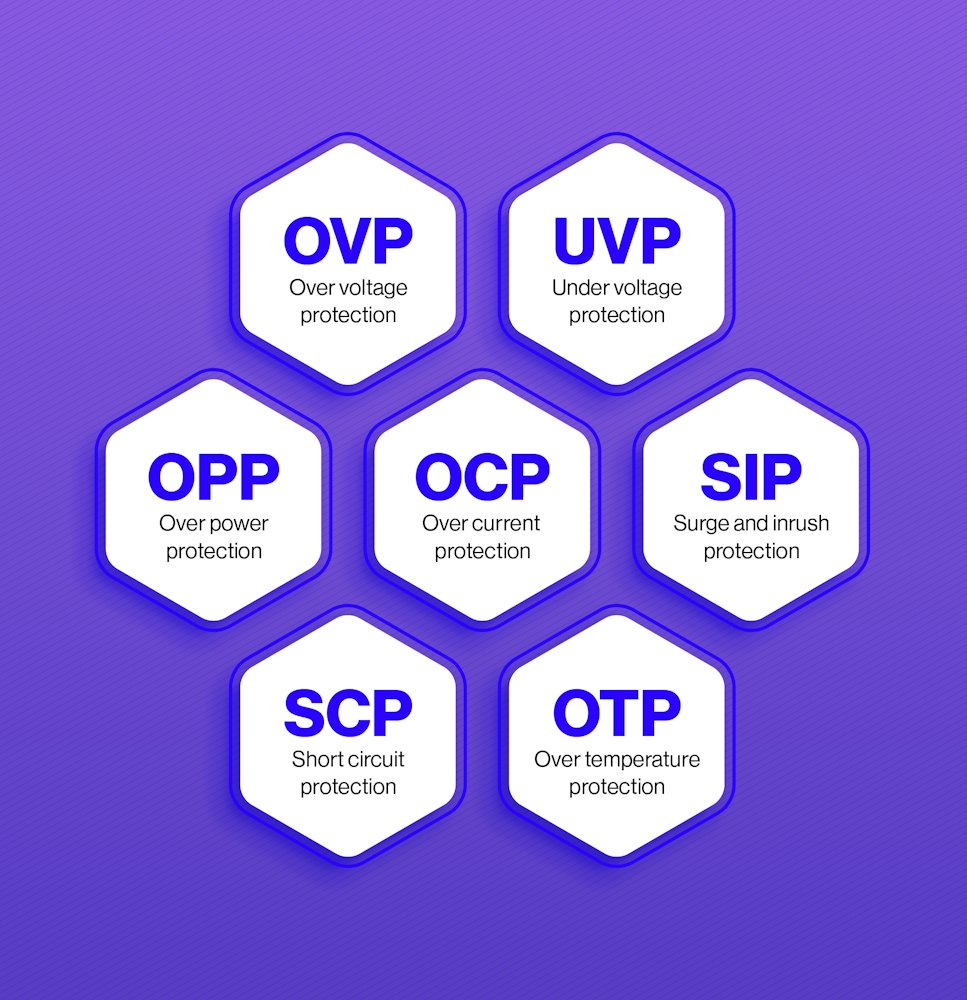 • Kompletní sada ochranných prvků OVP, UVP, OCP, SCP, OPP, SIP a OTP