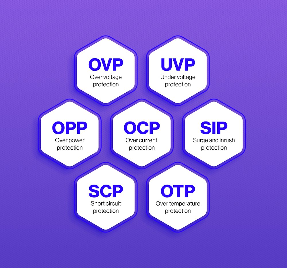 Zdroj obsahuje kompletní sadu elektrických a tepelných ochran včetně ochrany proti přetížení (OVP), podpětí (UVP), nadproudu (OCP), zkratu (SCP), přetížení (OPP), zapínacímu proudu (SIP) a přehřátí (OTP). Tyto prvky zajišťují maximální bezpečnost připojených komponentů.