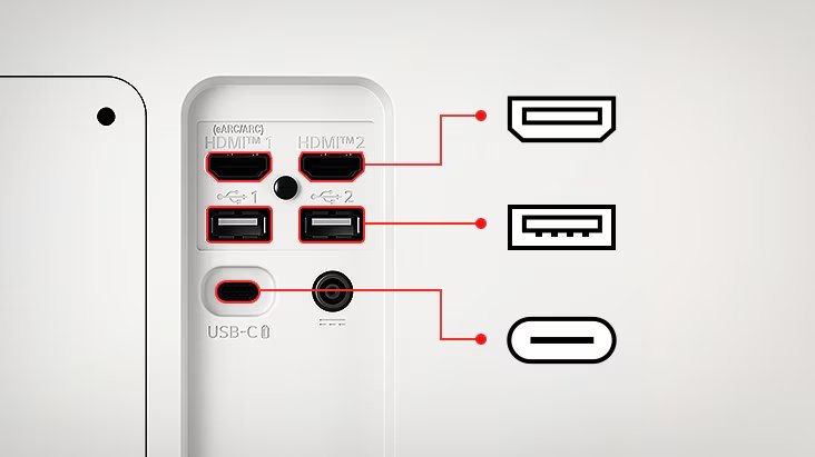 Monitor disponuje dvěma porty HDMI 2.0 s podporou HDCP 2.2, dvěma USB-A porty pro příslušenství a USB-C portem kombinujícím zobrazení, data i napájení. Bezdrátové zrcadlení obrazovky podporuje AirPlay 2 pro zařízení Apple a Screen Share pro Android.