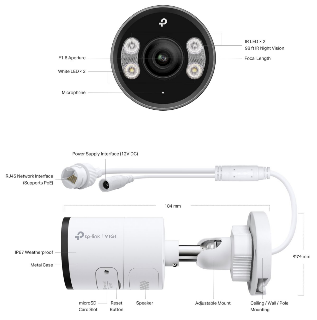 Napájení: DC 12 V (zdroj není součástí balení) nebo PoE 802.3af/at, příkon max. 10,7 W
